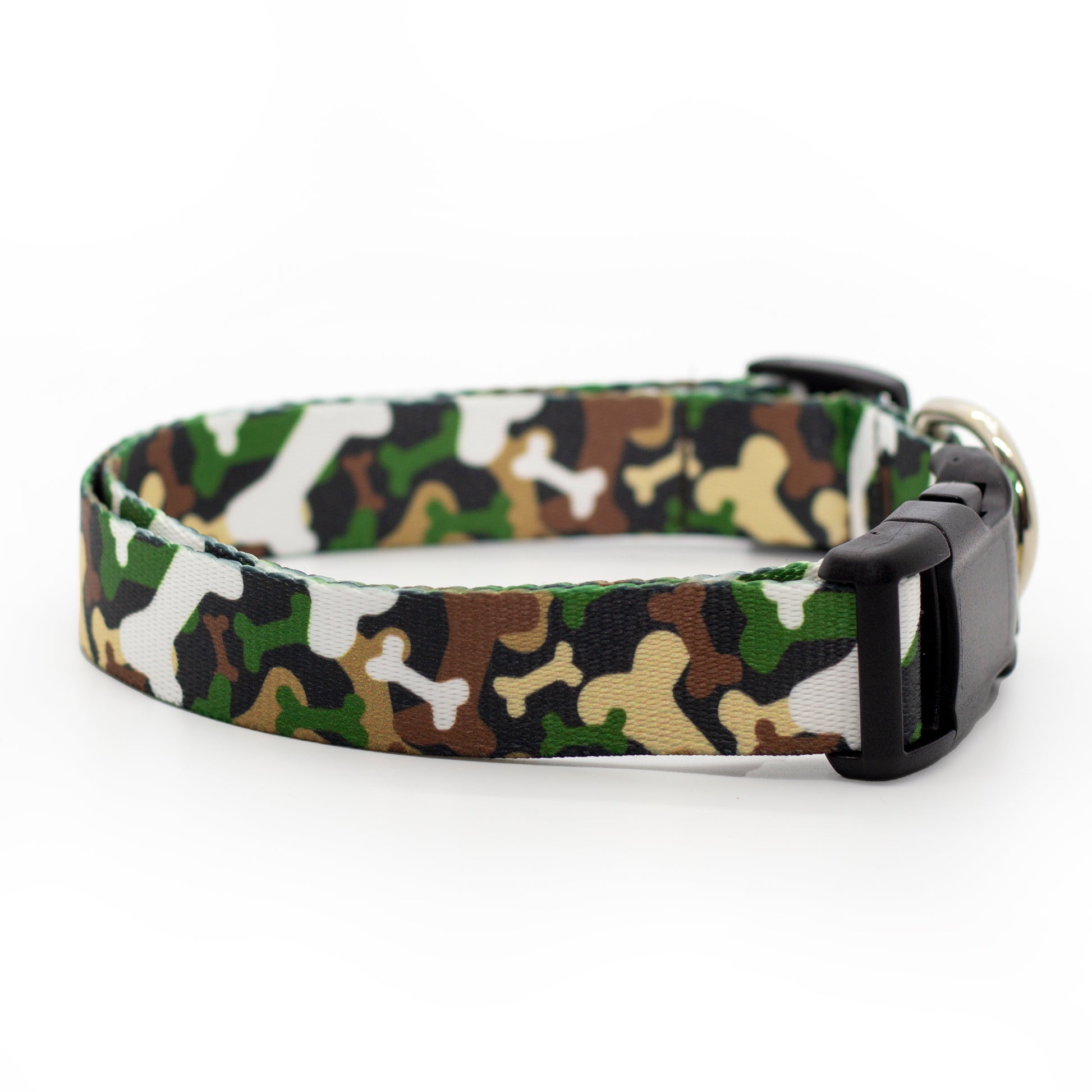 Get your pup ready for their next mission with the Bone-ouflage dog collar. This unique dog collar is adorned with a camouflage print made with playful dog bones, this collar will have them blending in seamlessly with their surroundings. Perfect for your furry little soldier!