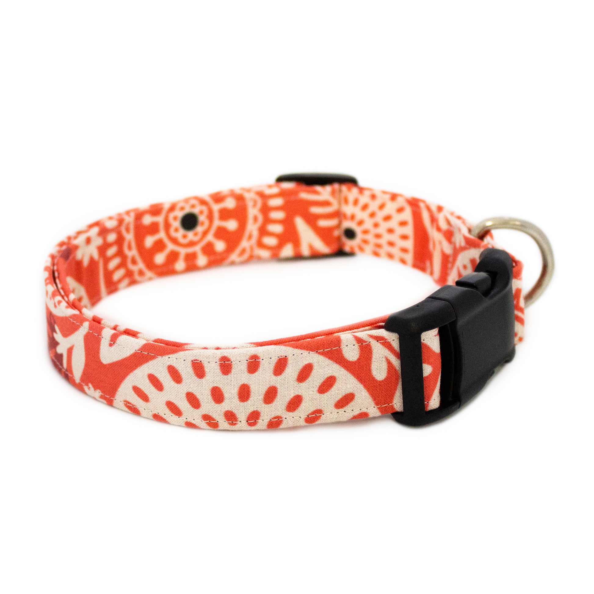 Make your furry friend stand out with the Coral Floral dog collar. Featuring a vibrant coral color and stylish white geometric designs, your pup will be the talk of the town. Pair with a coordinating bowtie or chiffon flower for that extra touch. Perfect for a playful and quirky pup who loves to make a statement.