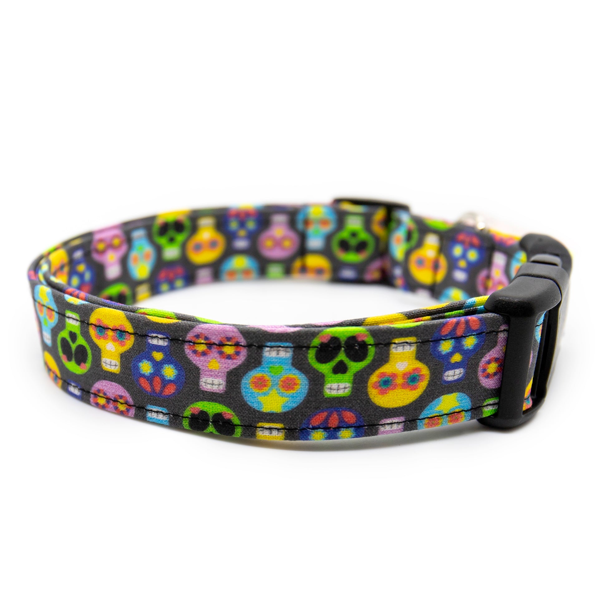 Celebrate your furry friend with Dia de los Doggos! This unique dog collar features colorful sugar skulls on a sleek black background. Your pup will stand out and show off their festive spirit. Walk your dog in style with this vibrant and eye-catching collar.