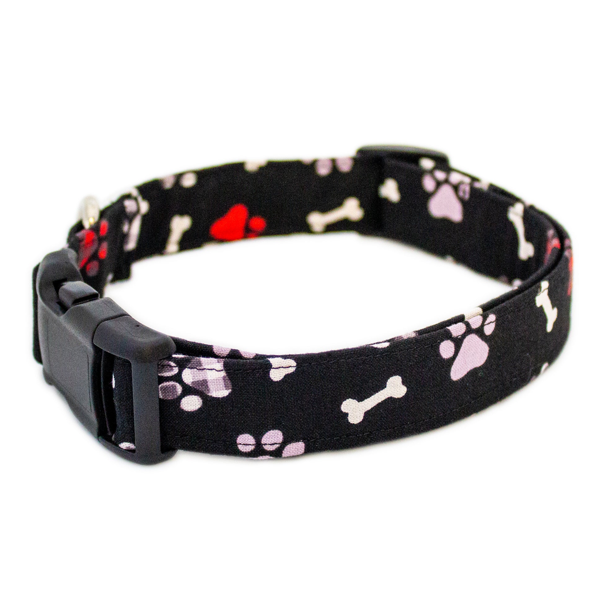 Elevate your furry friend's style with Paws and Plaid dog collar. Featuring a classic black background adorned with dog bones & paw prints - some in solid red or white, others in grey or red buffalo plaid, this collar is perfect for any occasion. Complete the look with our matching bowtie or one of our chiffon flowers for a pawsitively stylish statement.