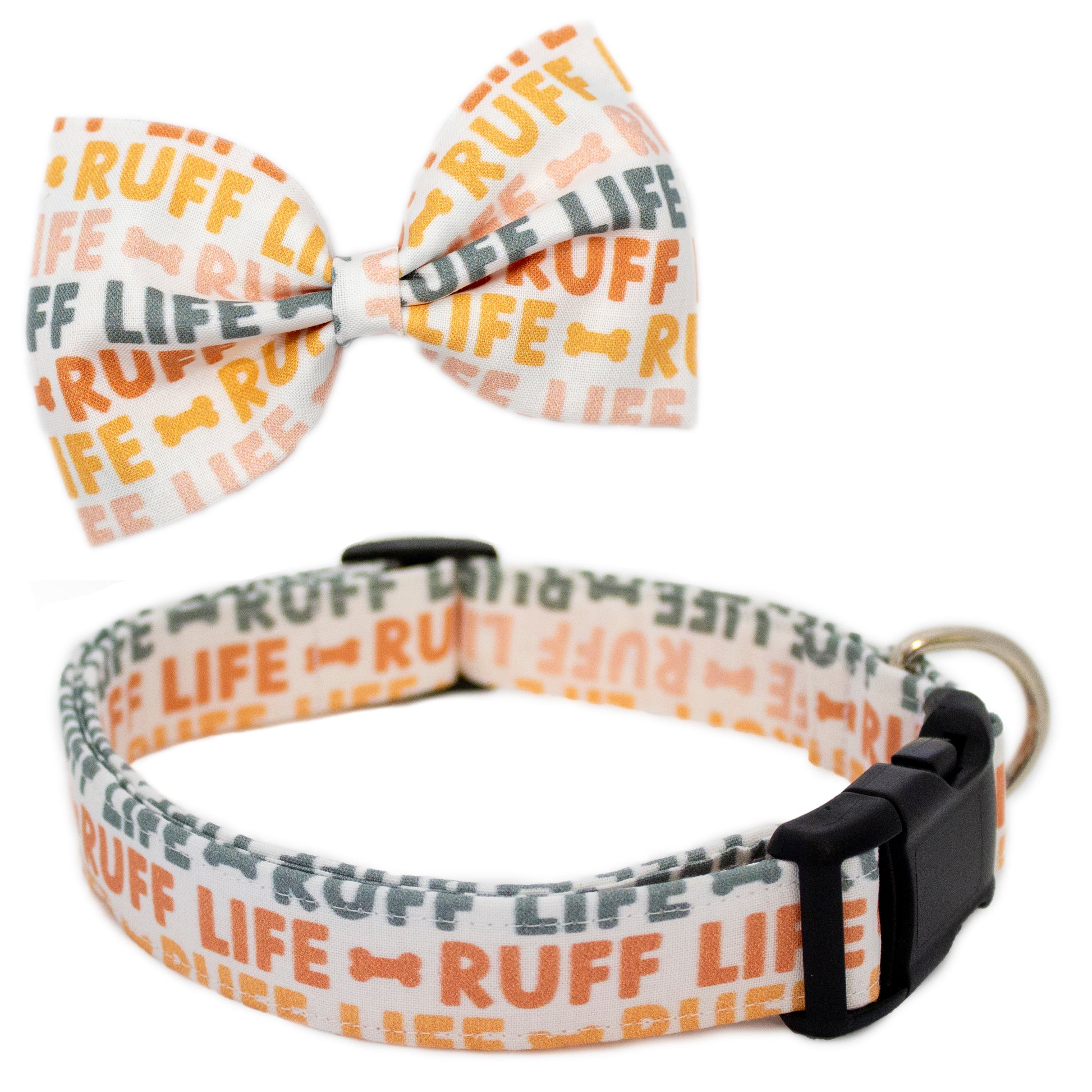 Unleash your pup's inner fashionista with Ruff Life! This vibrant collar is a statement piece, featuring a white background with the playful phrase "ruff life" in a mix of orange, yellow, and dark teal. It's a perfect match for every pup's unique personality. ** Want to take the look to the next level? ** Add a matching bowtie or choose a coordinating chiffon flower for the ultimate fashion statement. Ruff Life will have your dog strutting their stuff in style!
