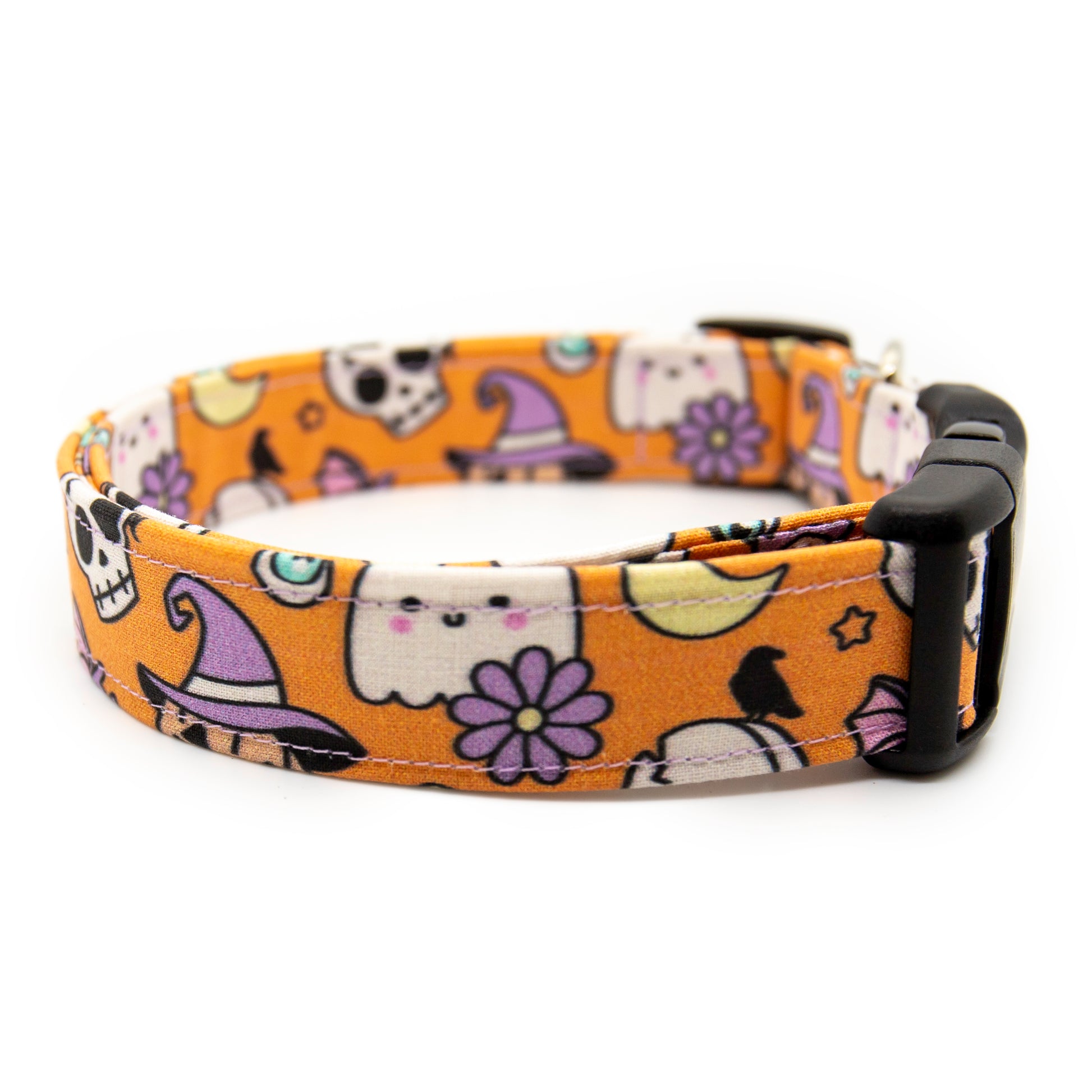 Unleash your pup's playful spirit with our Totally Ghoul dog collar. This ghoulish collar features designs of playful ghosts, jack-o-lanterns in witch hats, skulls, and more. Perfect for any spooky occasion! (And great for Halloween walks too!)
