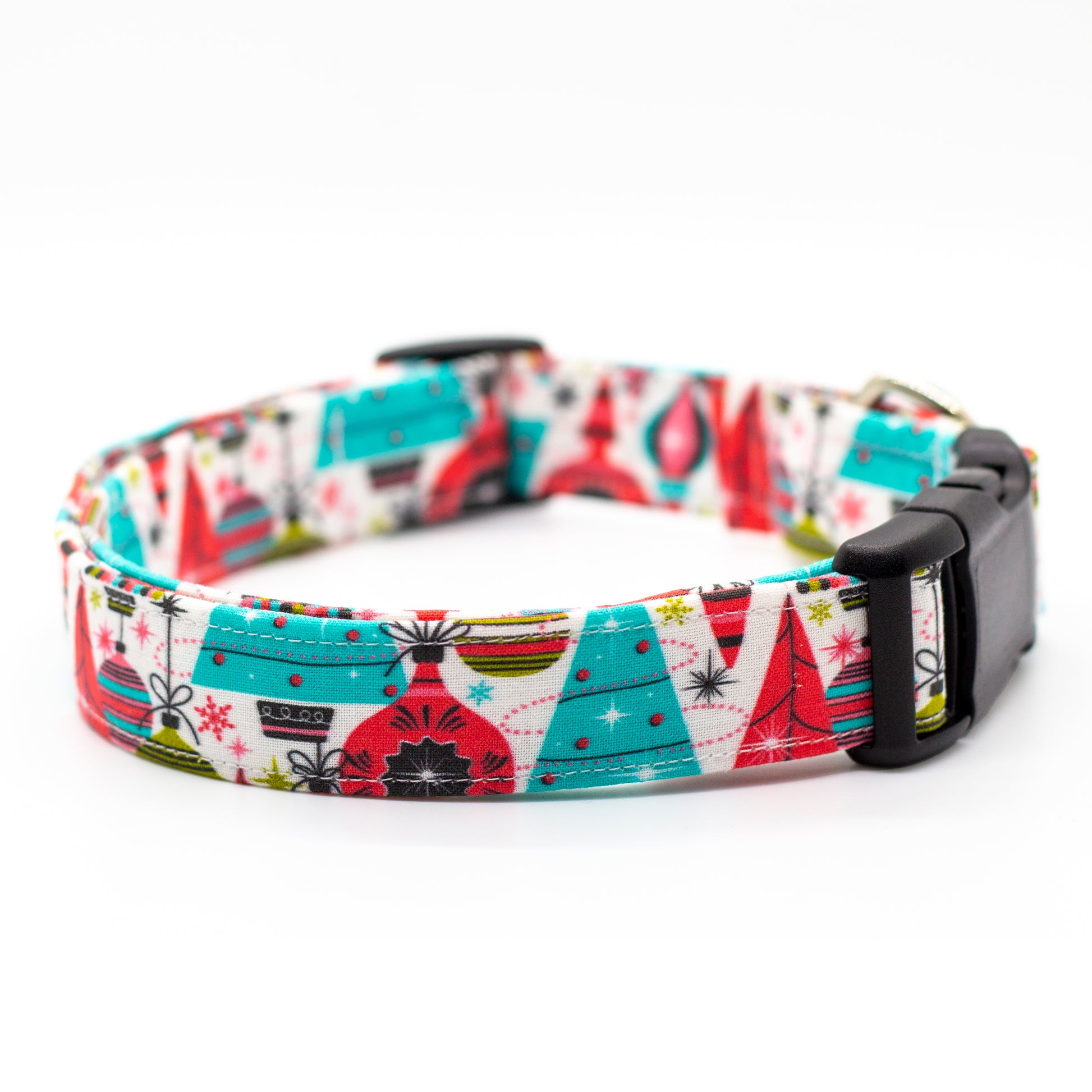 Elevate your pup's holiday look with our Tree-mendous Noel dog collar! This design features charming retro-style trees and ornaments in hot pink, green, and turquoise. Complete your furbaby's look with the matching bowtie or pair with one of our chiffon flowers for a pop of color! Your furry friend will be the talk of the town!